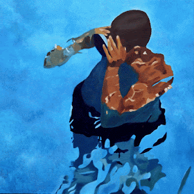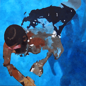 Estos cuadros los hice tomando como modelo a unos bañistas que fotografié en los años ’90 desde un noveno piso. Se bañaban a primera hora de la tarde, cuando el sol iluminaba el fondo de la piscina, de modo que se veía con claridad la parte sumergida de sus cuerpos. Los fotografié con una reflex de las de antes, así que escaneé las fotos en papel y de aquellos ficheros saqué los diferentes modelos...